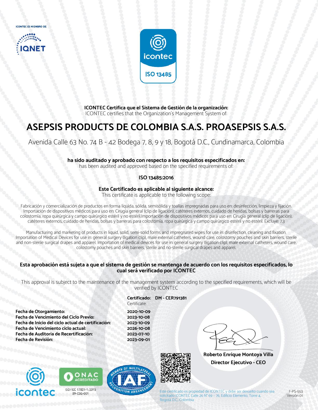 Organización creada en agosto de 1986, con gran experiencia en el mercado Hospitalario Colombiano con proyecciones y planes importantes para consolidar un papel de primer orden en el campo de los productos para el Control de las Infecciones y el Cuidado del Paciente. Esta empresa nació con la idea de crear una organización que se especializará en brindar a los profesionales de la salud en el país, una serie de productos destinados y orientados hacia todas las área de atención, haciendo especial énfasis en la Asepsia y Atención Integral del Paciente. Asepsis Products de Colombia SAS. Proasepsis SAS fabrica productos para la limpieza, antisepsia, desinfección y cosméticos en sus propias instalaciones, cumpliendo con Buenas Prácticas de Manufactura y Buenas prácticas de Laboratorio. Importa y comercializa elementos médico-quirúrgicos para la solución de problemas de salud